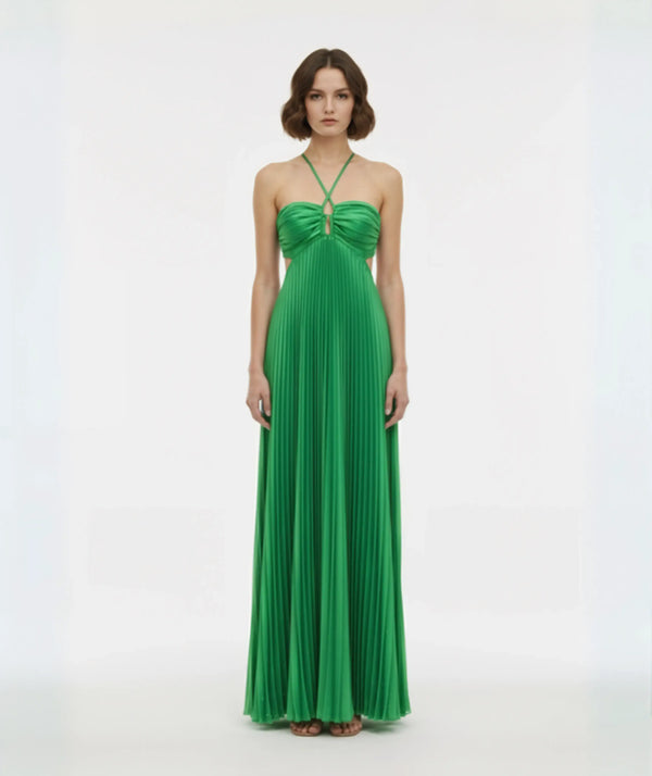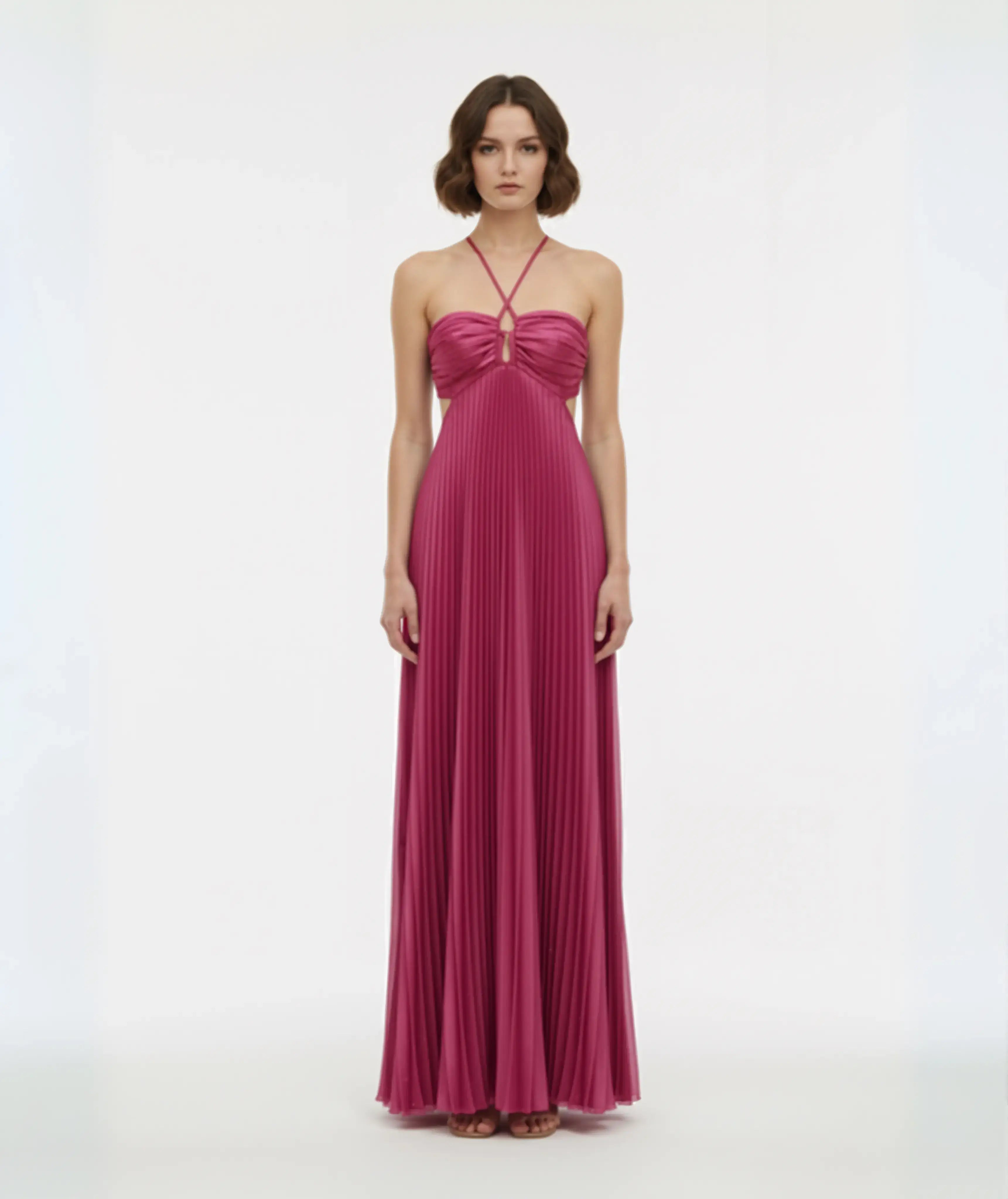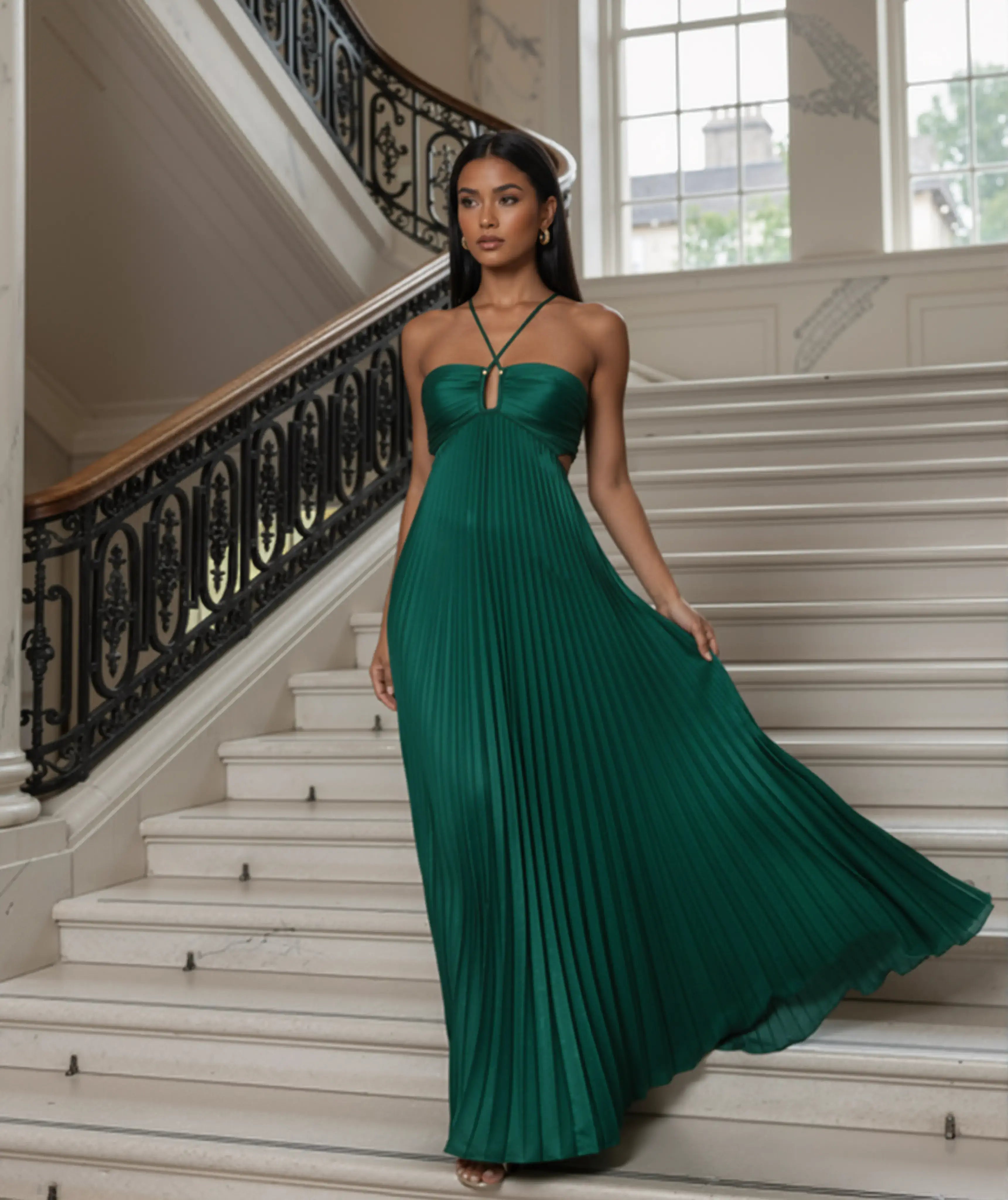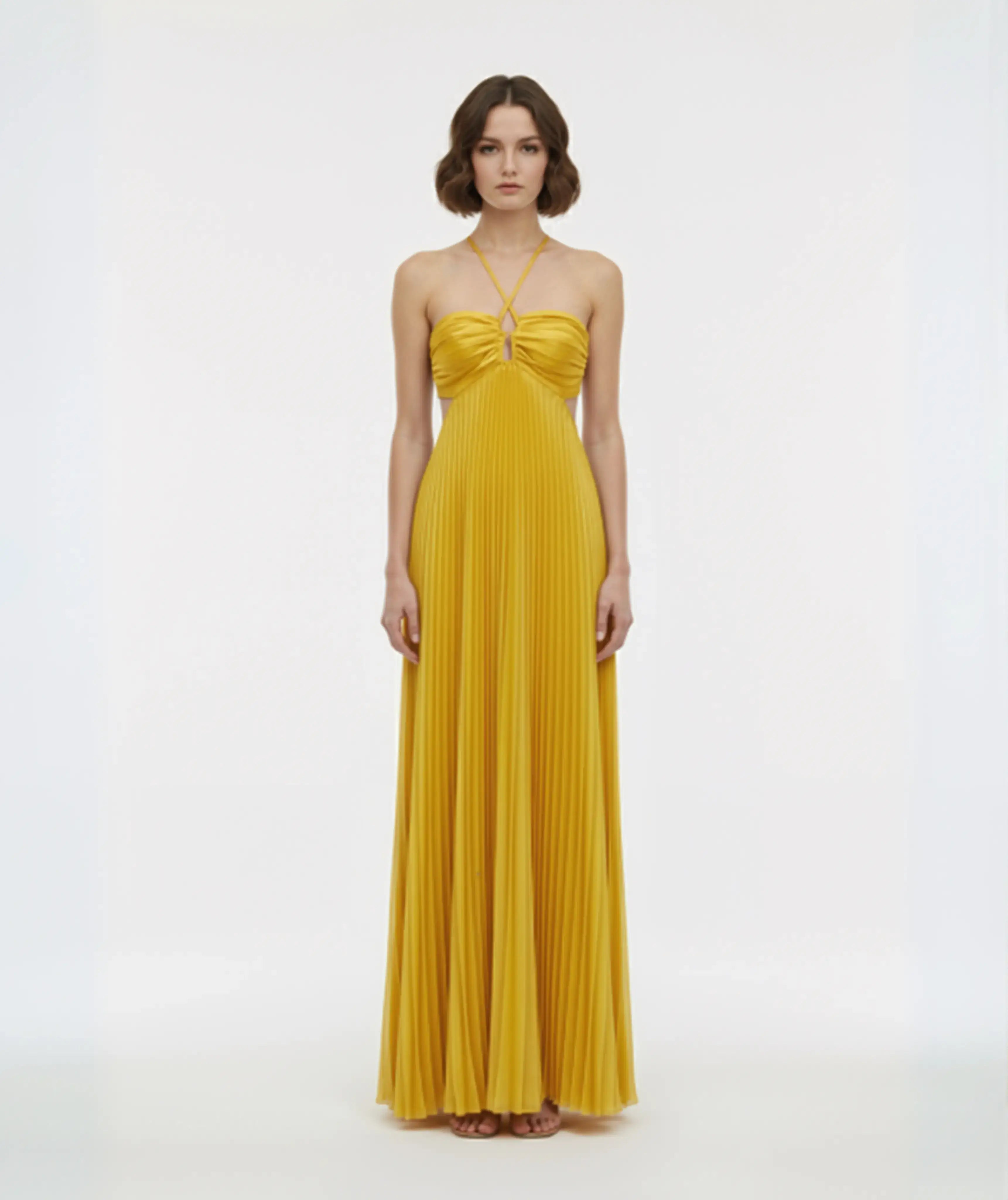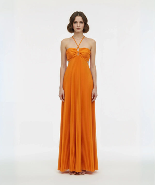 The Chelsea Dress embodies effortless elegance with its high-waist pleated design and halter neckline.