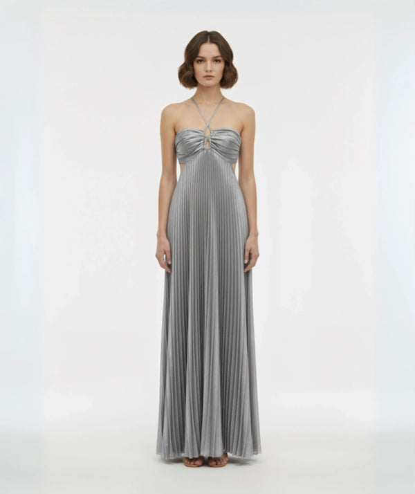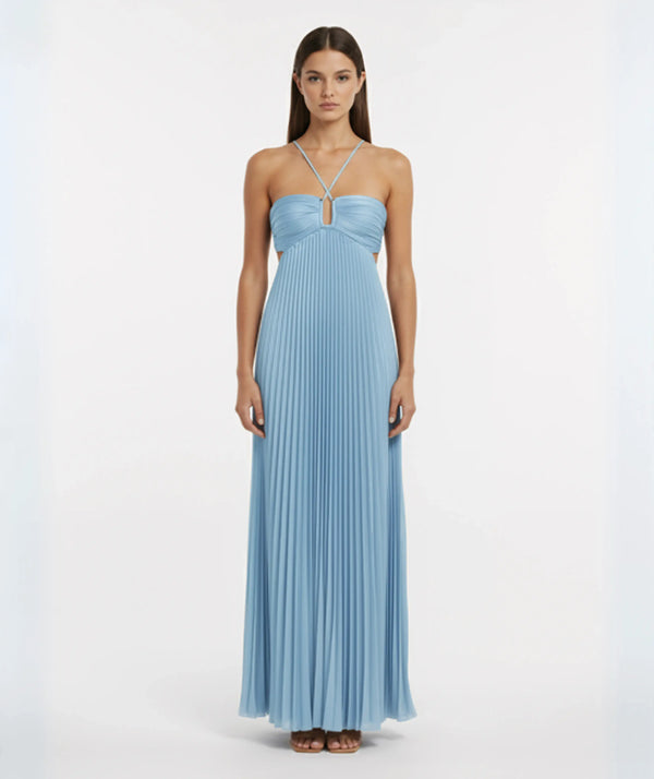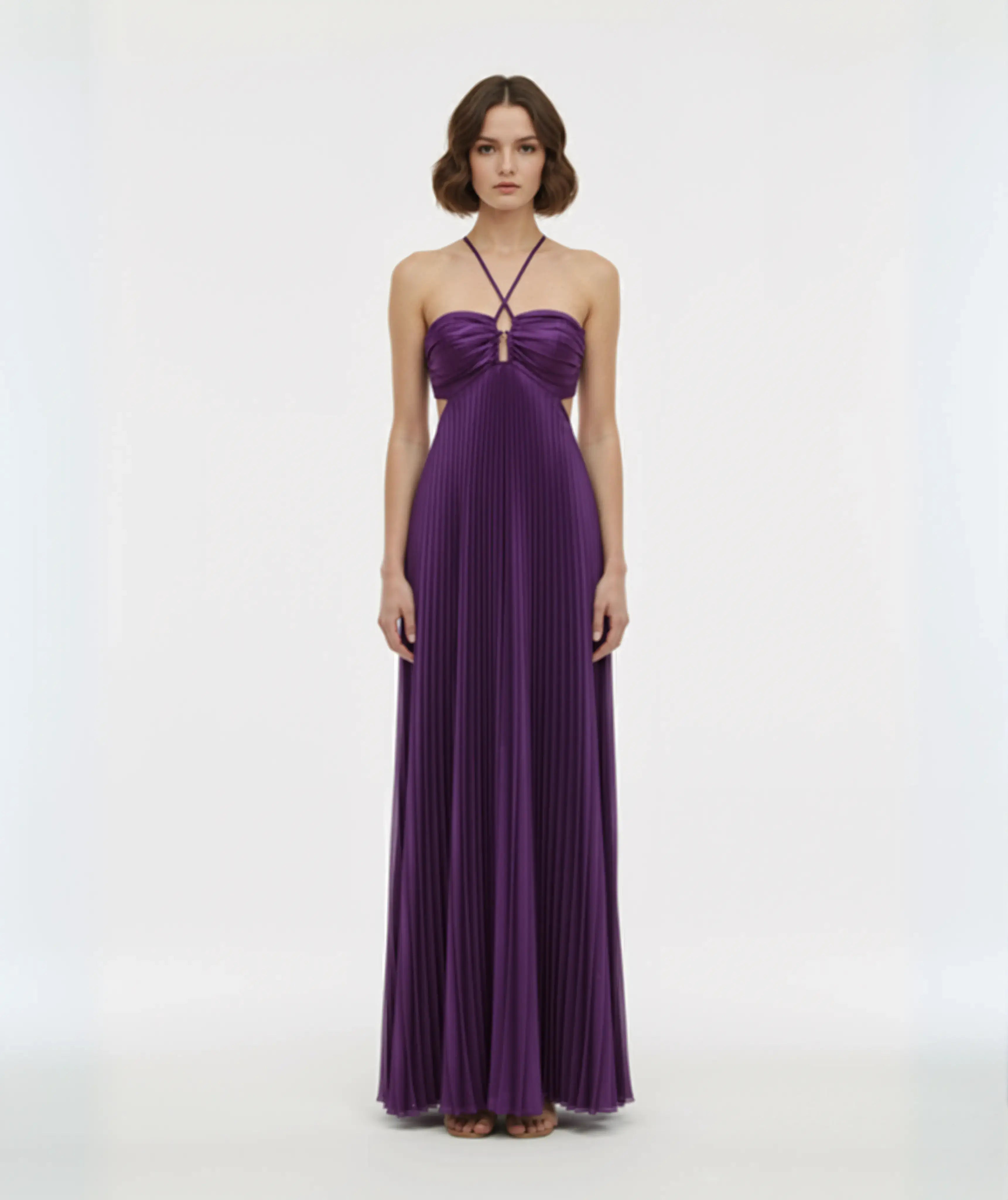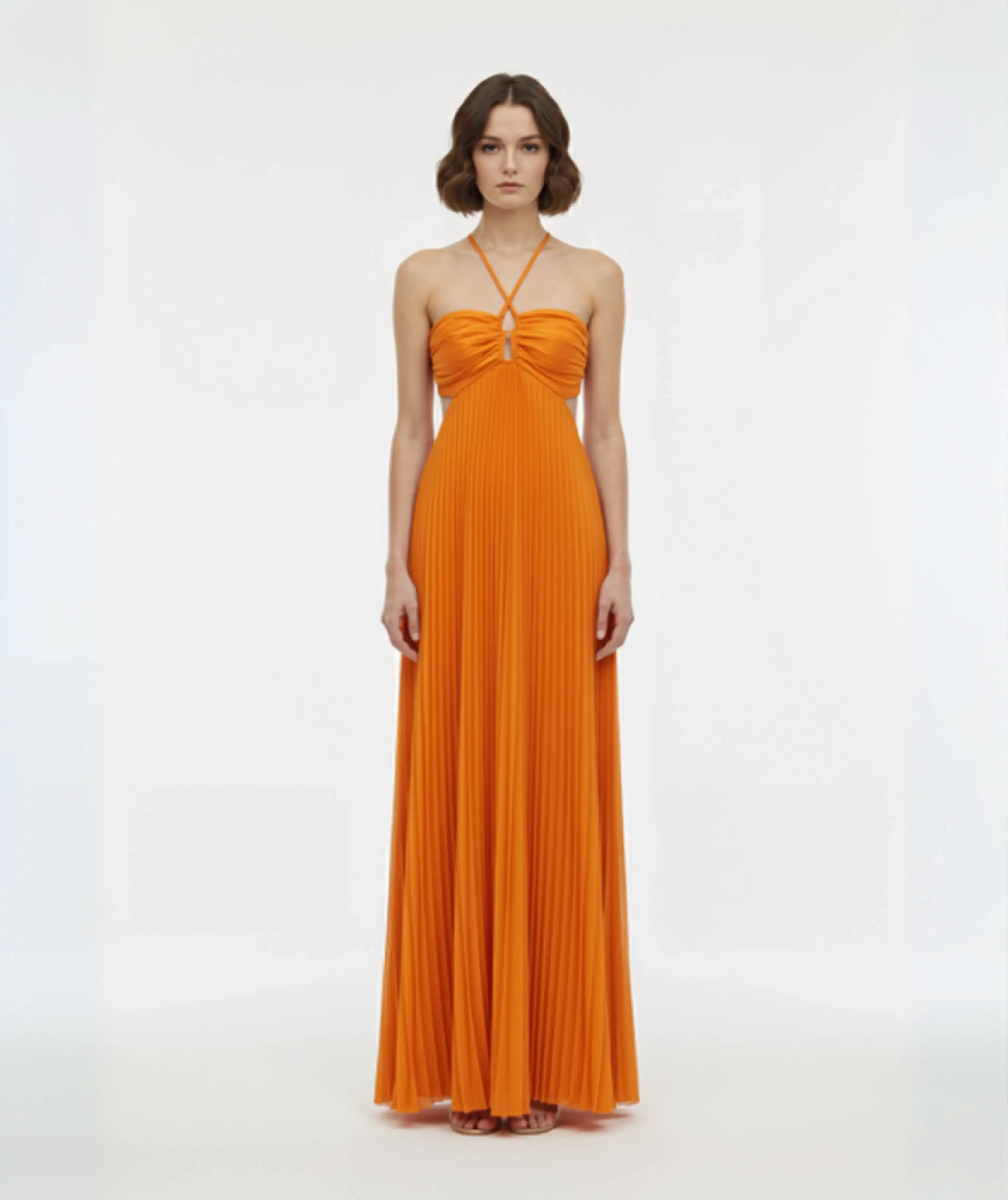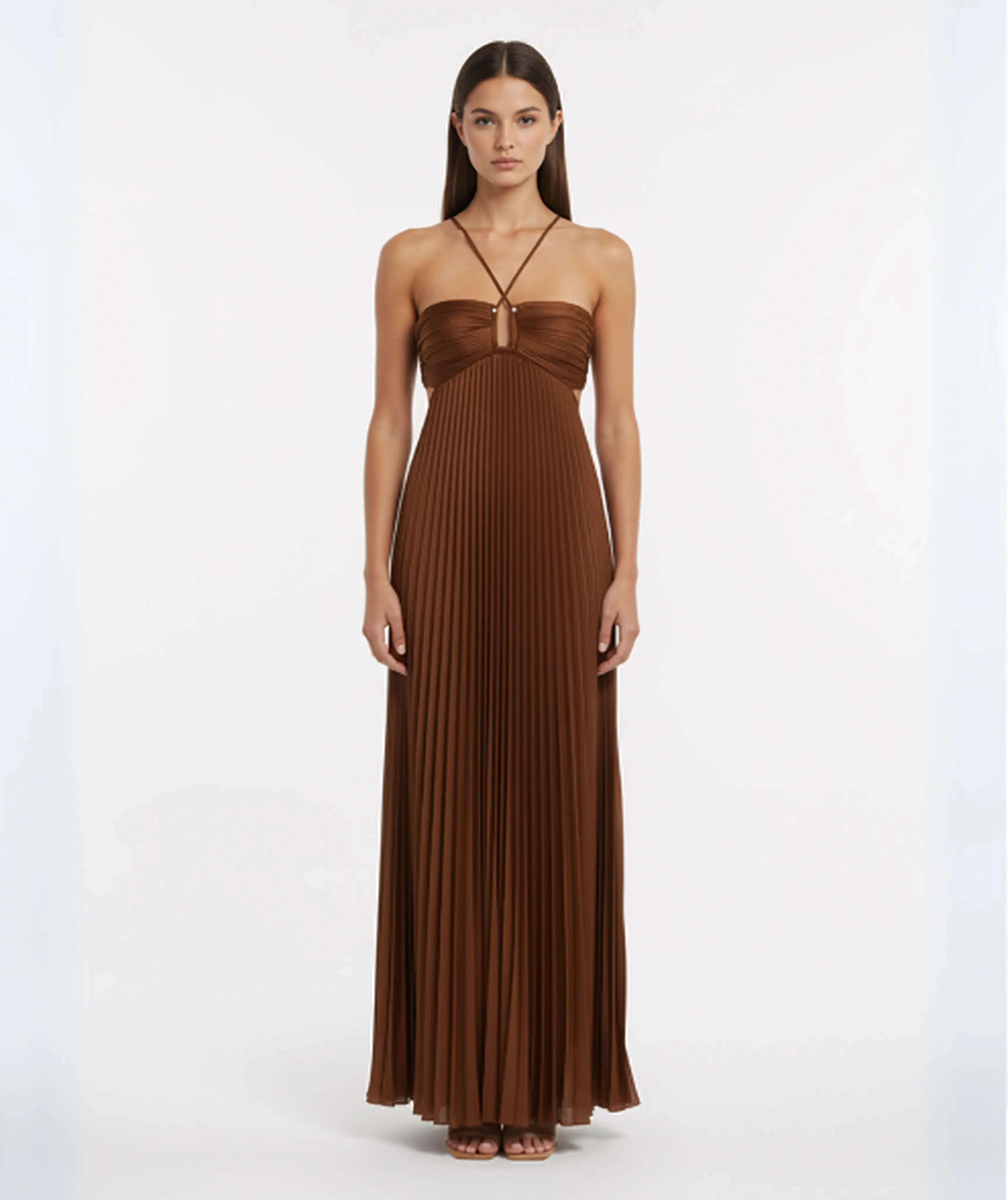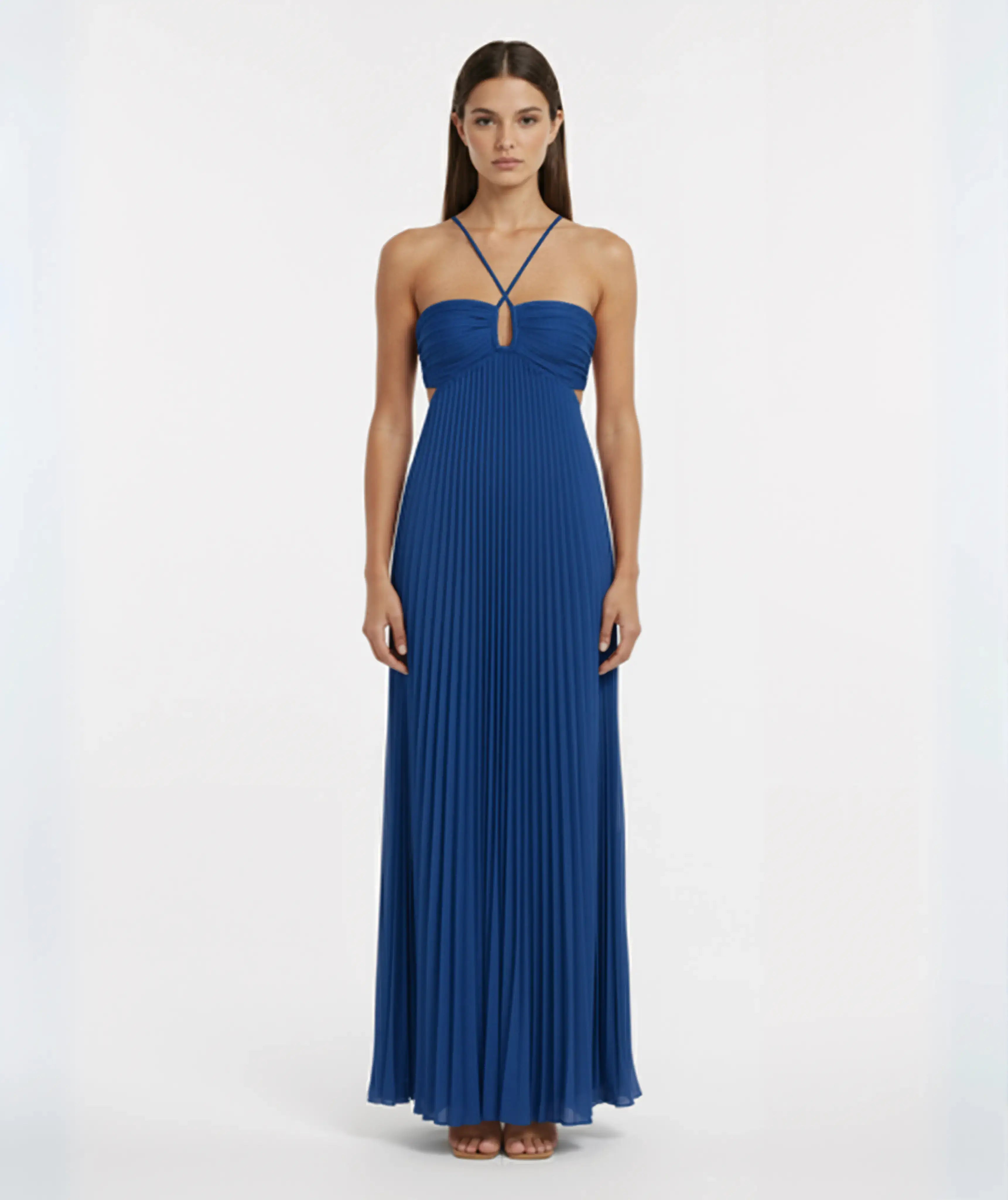 The Chelsea Dress embodies effortless elegance with its high-waist pleated design and halter neckline.