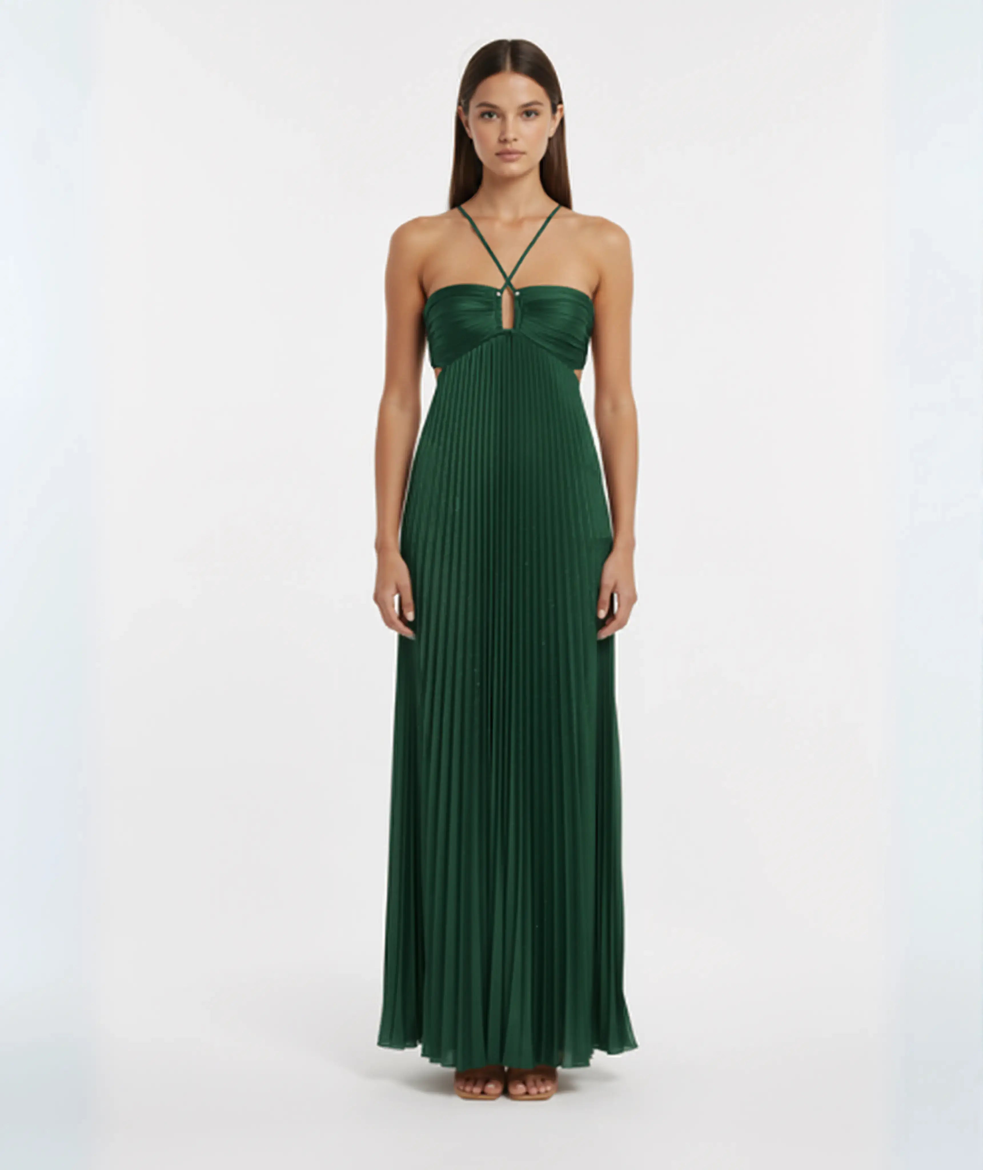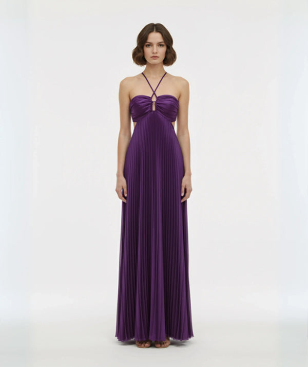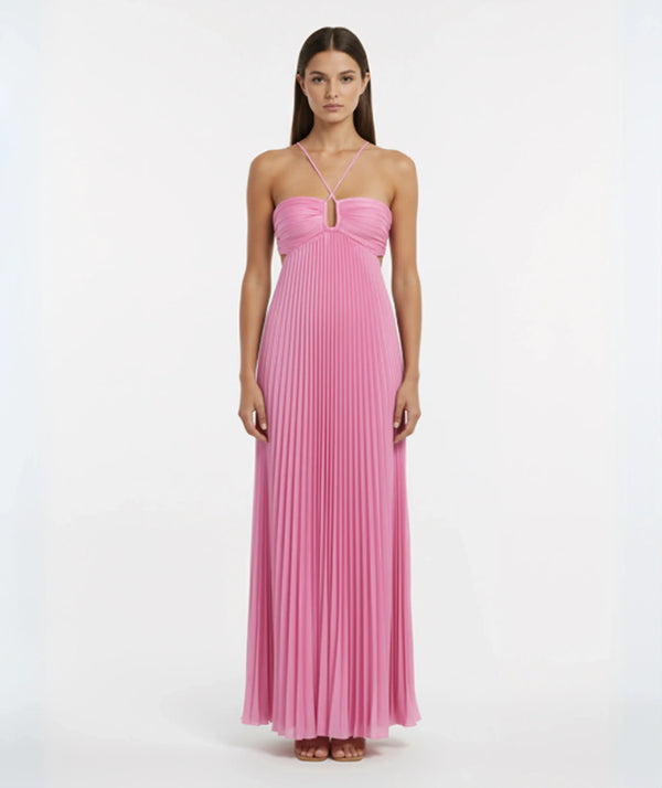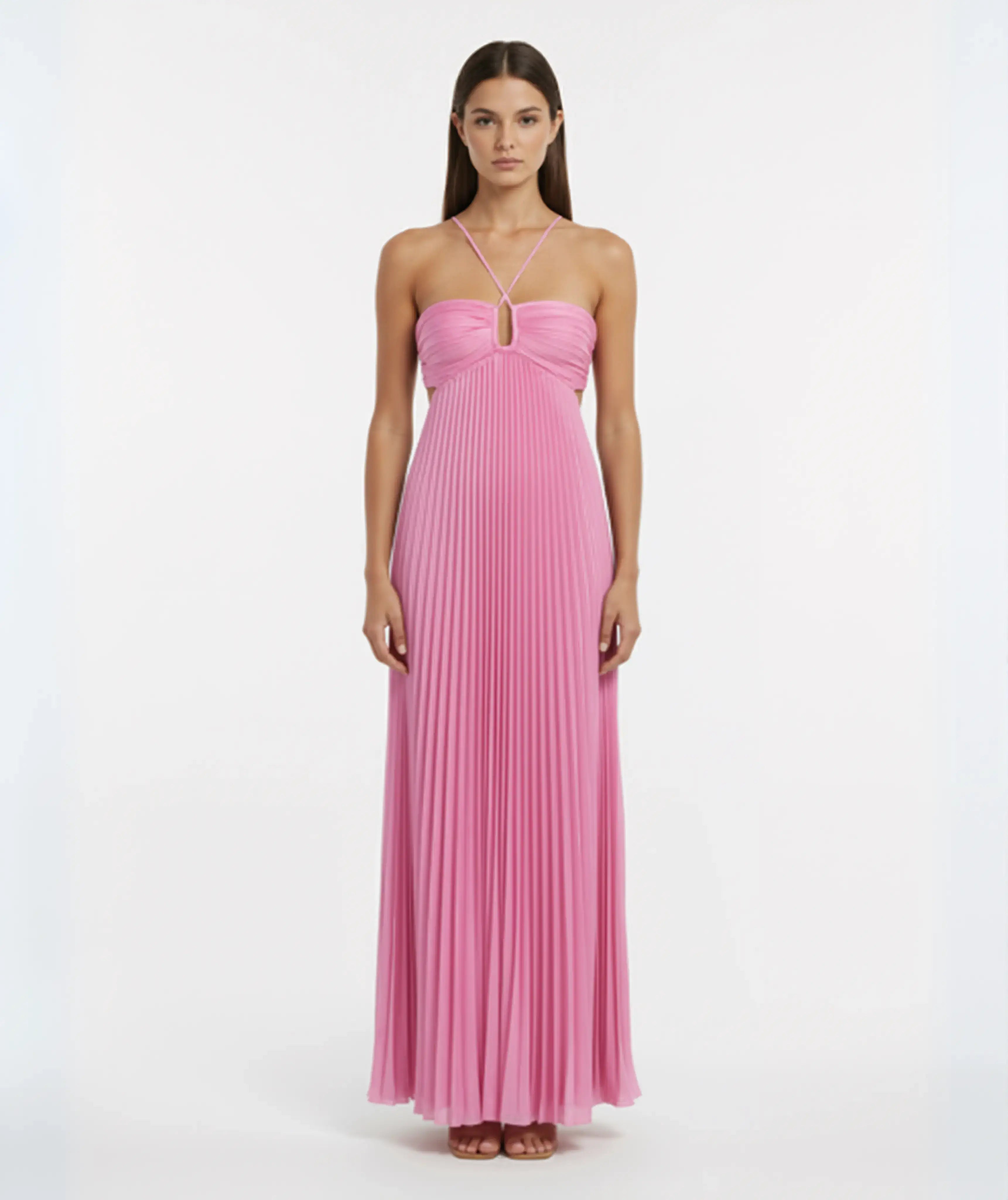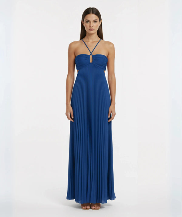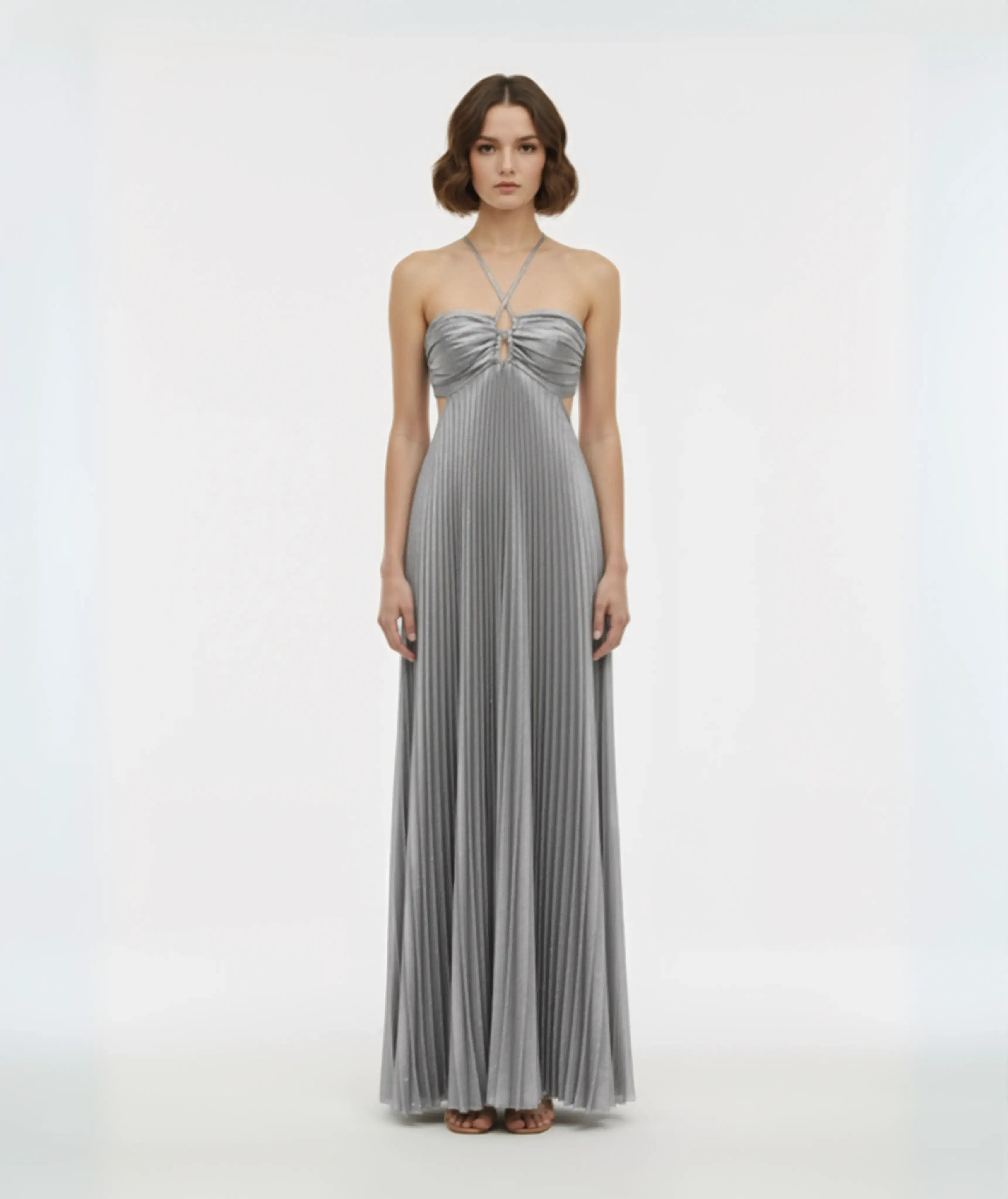 The Chelsea Dress embodies effortless elegance with its high-waist pleated design and halter neckline.